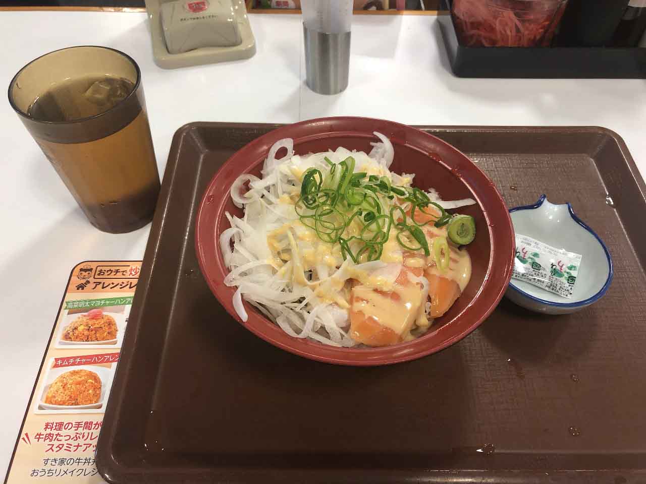 具材はメンマとネギ、チャーシュー細切れにオプションの半熟玉子。